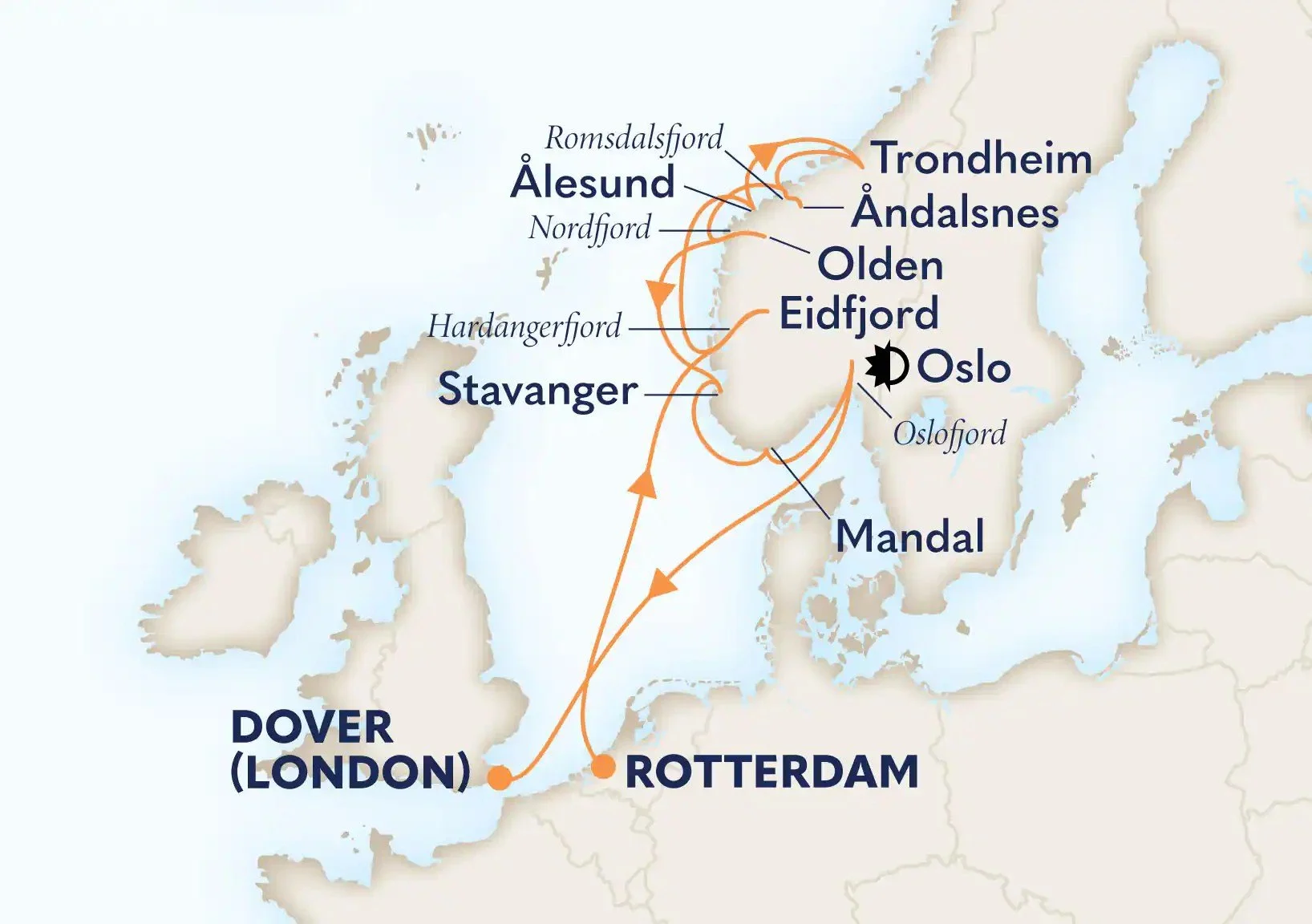 An overnight stay in Oslo allows you to explore the capital’s top sights, from the Oslo Opera House to Vigeland Sculpture Park, before scenic cruising along the Oslofjord reveals islands, historic landmarks, and coastal beauty.