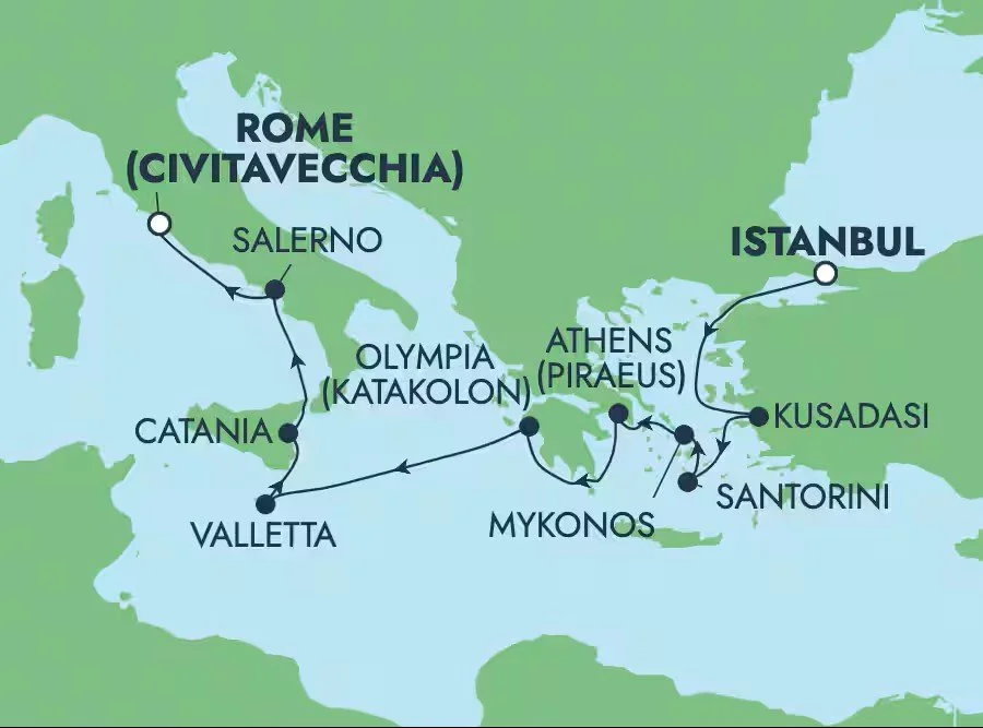 Come aboard one of our newest and most innovative ships, Norwegian Viva®, for an unforgettable Mediterranean cruise. Experience country life outside Kusadasi on our exclusive Go Local tour where you'll spend the day in a small village mingling with locals, helping harvest crops and savouring traditional Turkish cuisine. Enjoy a short ferry ride from Mykonos to the island of Delos - a UNESCO World Heritage Site and the mythological birthplace of Apollo and Artemis - and visit some of the well-preserved ancient ruins. Then you can feel like a Greek god or goddess in Athens while touring the Parthenon and other awe-inspiring historic sites. Journey from Catania to the otherworldly landscape surrounding Mt. Etna and soak in panoramic vistas from its summit and learn about Europe's largest active volcano.