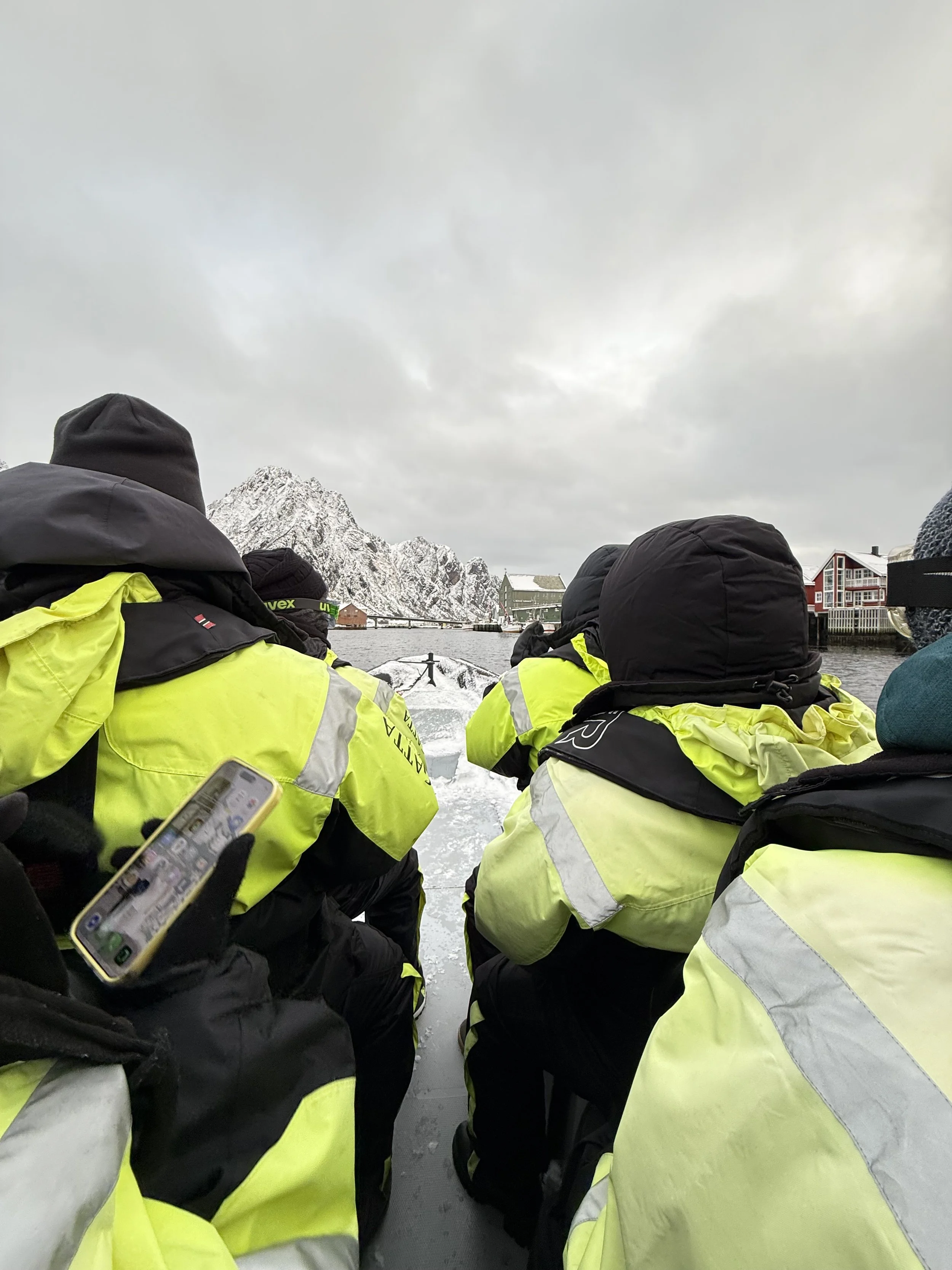 The main highlight of the day was the RIB Sea Eagle Safari, an excursion that turned out to be one of the most extraordinary experiences of the entire voyage. After gearing up in full thermal suits, the group set out on high-speed RIB boats, skimming across glassy water surrounded by towering, snow-covered cliffs.