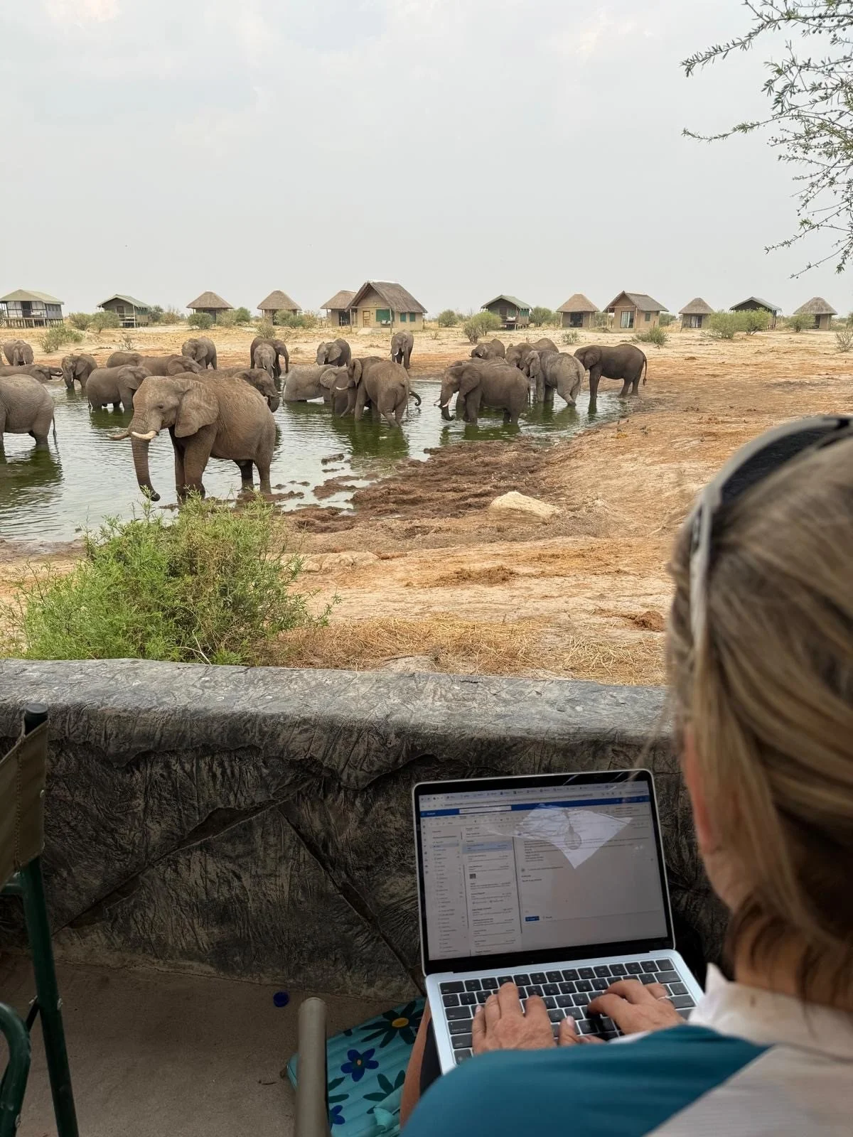 From their tent facing the pond, Kim and Hans watched elephants come and go for hours. It was, in Kim’s words, the best office view of the entire trip.